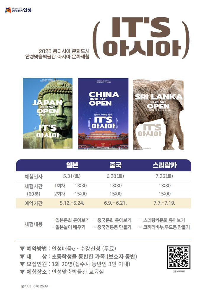 이번 체험 프로그램은 5월부터 7월까지 매달 마지막 주 토요일 '문화가 있는 날 주간'에 진행된다. 일본, 중국, 스리랑카 등 세 나라의 문화를 주제로, 원어민 강사가 직접 각국의 문화를 소개하는 '각 나라 톺아보기' 강연과, 가족이 함께 참여할 수 있는 놀이 및 만들기 체험 활동이 준비돼 있다.