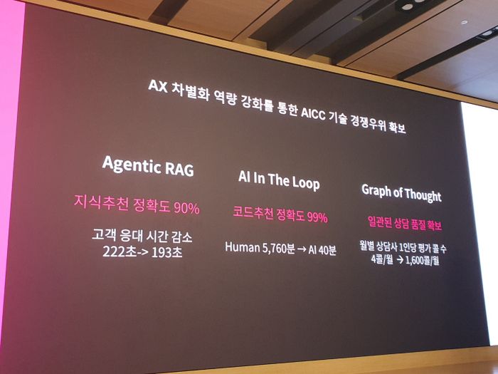 서남희 담당은 "기본적으로 구축된 AICC는 반제품이다. 완제품화하려면 얼마나 빠르게, 제대로 사용할 수 있는지 정확도나 품질 수준을 끌어올리느냐가 AICC 상품의 핵심"이라며 타사와의 차별점을 설명했다.