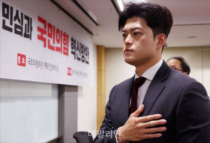 슬롯사이트 추천 국민의힘 비상대책위원장이 지난 19일 오전 서울 여의도 국회 의원회관에서 열린 '대선 패배 후 민심과 국민의힘 혁신방안'을 주제로 국민의힘 혁신방안 토론회에서 국민의례를 하고 있다. ⓒ슬롯사이트 홍금표 기자