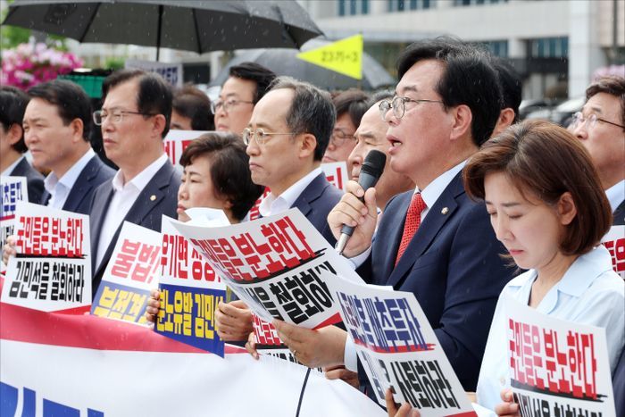 송언석 프라그마틱 슬롯 사이트의힘 당대표 권한대행 겸 원내대표가 1일 오전 서울 용산구 대통령실 앞에서 열린 프라그마틱 슬롯 사이트의힘 현장 의원총회에서 규탄 발언을 하고 있다. ⓒ슬롯사이트 홍금표 기자