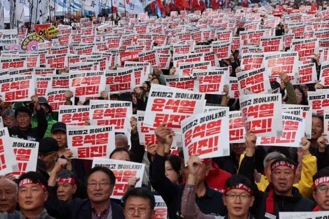 지난해 11월9일 서울 숭례문 일대에서 열린 민주노총 전태일열사 정신계승 2024 전국노동자대회·1차 퇴진 총궐기에서 민주노총 조합원들이 구호를 외치고 있다.ⓒ연합뉴스