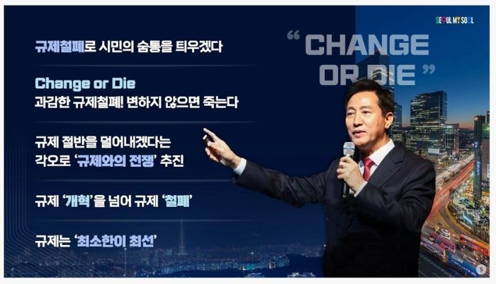 오 시장은 "낡고 경직된 규제는 시민 일상을 불편하게 만들고 기업 도전을 가로막아, 결국 서울의 미래를 제약하는 족쇄로 작용할 수밖에 없다"며 "지금은 규제를 푸는 것이 곧 경제를 살리는 길이며 시민의 삶을 더 나아지게 만드는 길"이라고 말했다.
