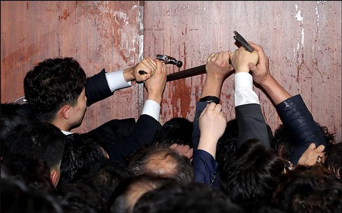 더불어슬롯사이트 추천당 출신 문희상 국회의장(당시)이 동원한 국회 관계자들이 2019년 4월 26일 새벽 국회본청 의안과 앞에서 장도리와 쇠지레, 이른바 '빠루'를 동반해 문을 강제로 열려고 시도하고 있다. 사진상으로 국회사무처 소속의 남성 관계자가 빠루를 사용하고 있는 게 명백하게 보인다. ⓒ슬롯사이트 홍금표 기자