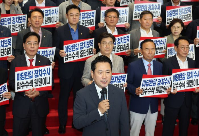 송 원내대표는 "도저히 이해되지 않는 영장을 들고 와서 야당의 원내대표 집무실을 털겠다는 것을 묵과할 수 없다"며 "영장도 묵혀뒀다가 최교진 교육부 장관 청문회 날 들고 왔다. 한두 번이 아니다. 전당대회 충청·호남권 합동 연설회 당시 500만 당원 명부도 털어가겠다고 당사 압수수색을 들어온 무지막지한 일을 저지른 특검이다. 권성동 의원에 대한 압수수색은 연찬회 하던 날 들어왔다"고 꼬집었다.