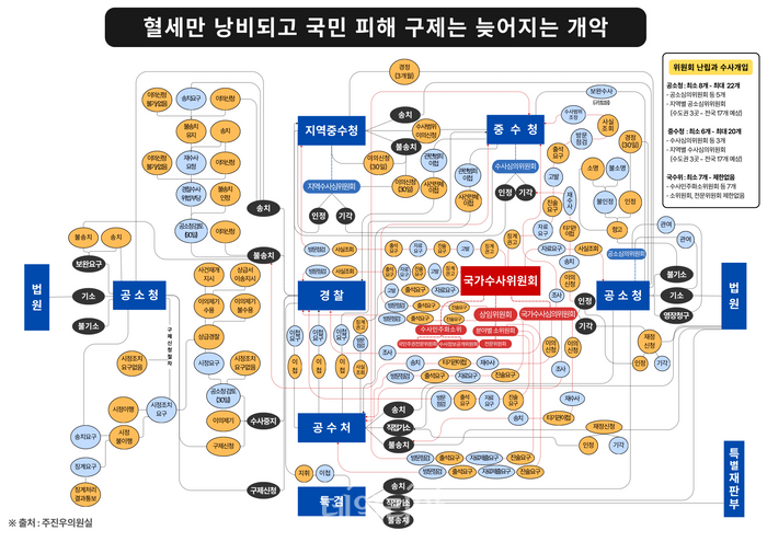 라이징슬롯 의원은 9일 페이스북에 정부·여당이 추진하는 수사 조직 개편도를 공유하며 "너무 복잡해서 만든 사람도 모르는 민주당의 수사 개편안"이라며 "딱 봐도 국민들만 죽어날 각"이라고 비판했다.