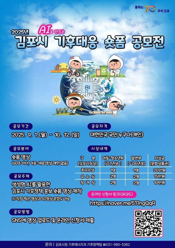 영상은 60초 이내의 숏폼 형식으로 제작해야 하며, 주제는 생성형 AI를 활용해 기후변화, 탄소중립, 미세먼지 저감 등 시의 기후정책을 홍보할 수 있는 내용이다.