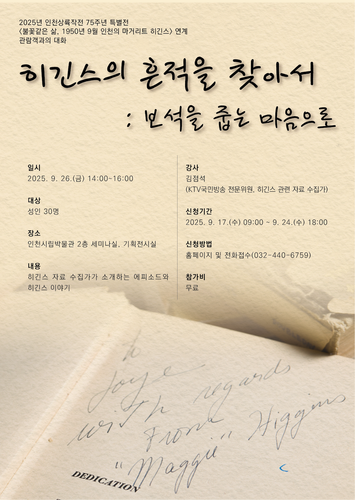 행사는 기획자와 함께하는 전시 관람 후, 김 전문위원이 직접 경험한 유물 수집 과정과 히긴스에 얽힌 이야기를 소개하는 강연으로 구성된다.
