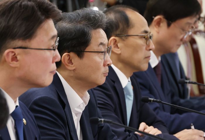 류제명 과기정통부 제2차관(왼쪽부터)과 이억원 금융위원장, 고학수 개인정보위원장 등이 22일 슬롯 무료 사이트서울청사에서 열린 통신사 및 금융사 해킹사고 관련 긴급 현안 점검회의에서김민석국무총리의 발언을 듣고 있다. ⓒ연합뉴스