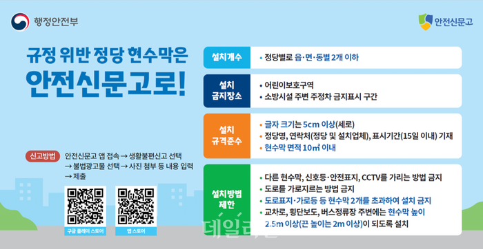 위반 사례가 확인되면 우선 자진 철거와 위치 이동을 요구하고, 이를 이행하지 않을 경우 지자체가 직접 철거한다. 슬롯 꽁 머니는 주민 참여 강화를 위해 ‘안전신문고’를 통한 불법광고물 간편 신고 방법도 안내하고 있다.