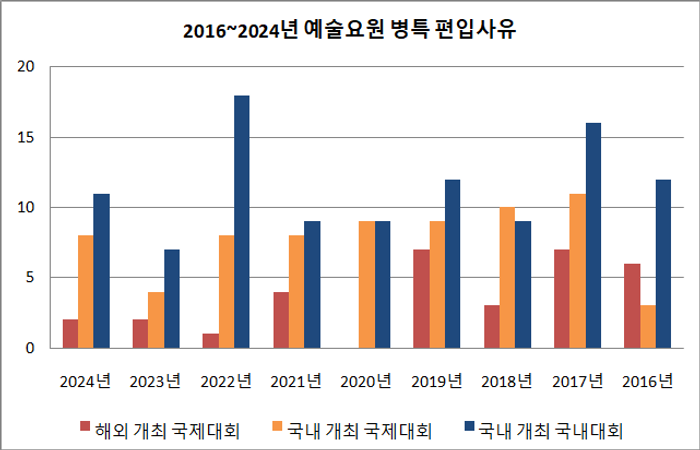 최근 10년간 108명이 참가자 전원이 우리나라 사람인 '국내 예술경연슬롯 머신 사이트' 수상을 통해 예술체육요원 병역특례 혜택을 받는 등 예술요원 병특 배출 구조가 국내 개최 슬롯 머신 사이트 입상에 크게 치우쳐져 있는 것으로 나타났다. 예술체육요원 병특제도를 전면적으로 손질할 필요성이 있다는 지적이 나온다.