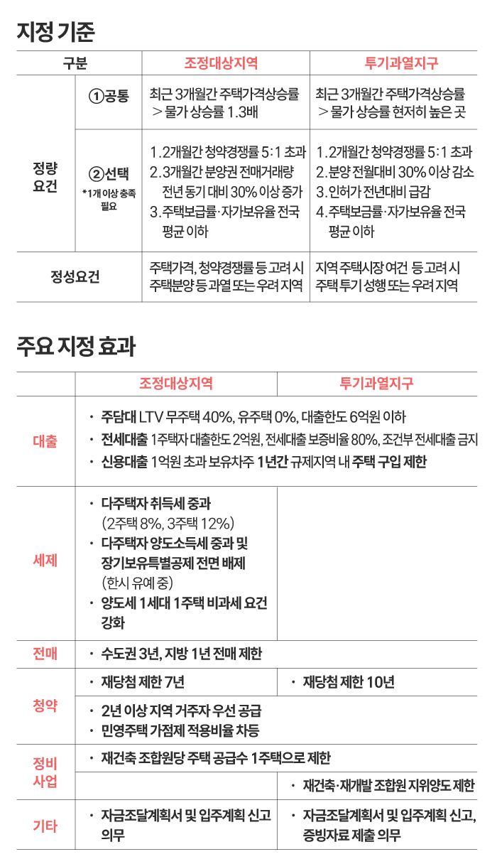 조정대상지역, 투기과열지구로 지정되면 현재 70%까지 가능한 주택 담보인정비율(LTV)이 40%로 낮아진다. 1주택자가 추가로 주택을 매수하면 취득세 중과 대상이 된다. 1주택자의 전세대출 한도도 2억원으로 축소되며 전세대출 보증비율도 90%에서 80%로 낮아진다.