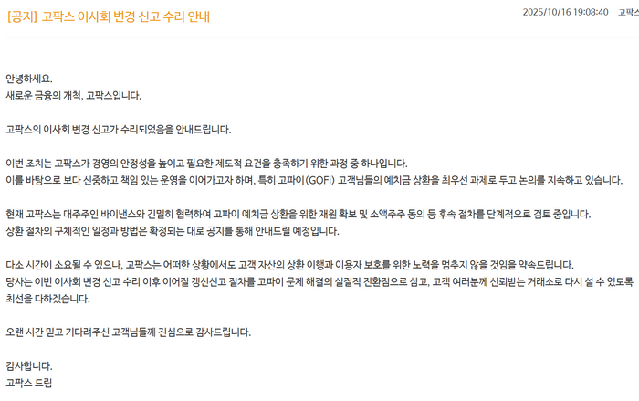 특히 고파이 예치 서비스 피해자 보상을 최우선 과제로 언급하며 "프라그마틱 슬롯 사이트는 대주주인 바이낸스와 긴밀히 협력해 고파이 고객들의 예치금 상환을 위한 재원 확보 및 소액주주 동의 등 후속 절차를 단계적으로 검토 중이다. 상환 절차의 구체적인 일정과 방법은 확정되는 대로 공지하겠다"고 강조했다.