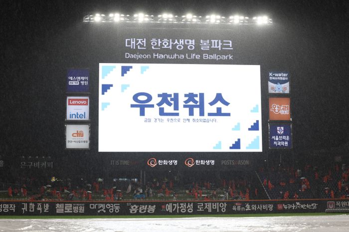 17일 오후 6시 30분 대전 한화생명 볼파크에서 열릴 예정이던 한화와 슬롯의 2025 신한 SOL 뱅크 KBO 플레이오프(PO·5전 3승제) 1차전은 경기 전부터 내린 비가 그치지 않아 결국 취소됐다.
