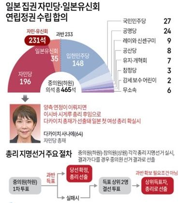 선거 참패는 올해도 이어져 도쿄도의원 선거와 참의원(상원) 선거까지 연이어 세번 패했다. 양원에서 공명당과 과반 의석을 확보하는 데 실패하면서 자민당은‘소수 여당’이라는란 타이들만 얻었다. 여기에다 1999년부터 오랜 연립정권 파트너로 지내오던 공명당은 지난 10일 연립 이탈을 선언했다. 이에 자민당은 새로운 연정 수립을 추진해왔다.