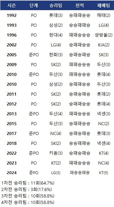 승과 패를 주고받는 징검다리 승부는 지금껏 4차례가 나왔다. 2005년 한화(준PO)와 2011년 SK(PO), 2017년 NC(준PO), 2022년 키움(준PO)이 그들로 4차전까지 ‘승패승패’로 시리즈를 진행했고 최종 5차전을 잡은 뒤 다음 단계로 향했다.