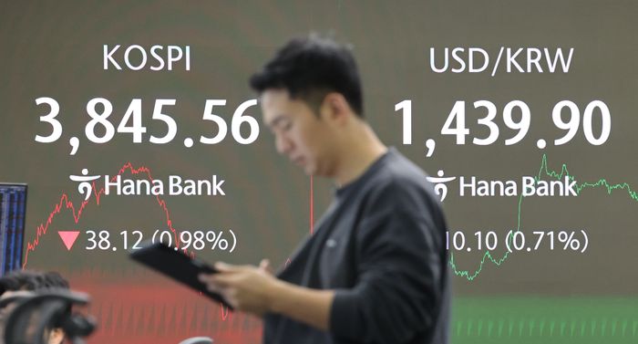 23일 서울 중구 하나은행 딜링룸 현황판에 온라인 슬롯피 종가와 원·달러 환율이 표시돼있다. ⓒ연합뉴스