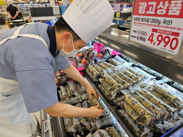 안전 슬롯사이트 직원이 굴 매대에 상품을 진열하고 있다.ⓒ안전 슬롯사이트