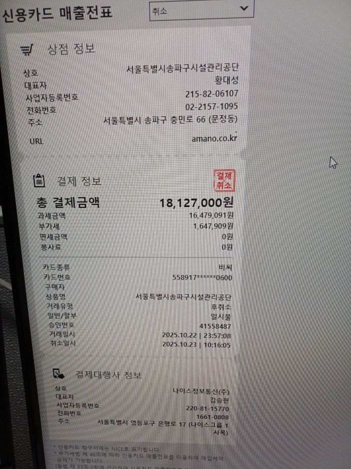 그는 "송파구시설관리공단에 전화를 해 봤지만 밤늦은 시간이라서 아무도 전화를 받지 않았고, 할 수 없이 다음날인 23일 오전 9시가 돼서야 겨우 공단 담당직원과 통화를 할 수 있었다"며 "마음을 졸이면서 신용카드 회사에도 전화를 하고 결제대행사에도 전화를 하고 시설관리공단에도 전화를 하고 여러번 전화를 한 끝에 결국 공단 담당자가 결제 취소 처리를 해 줬다. 여기에 걸린 시간이 대략 1시간30분"이라고 설명했다.
