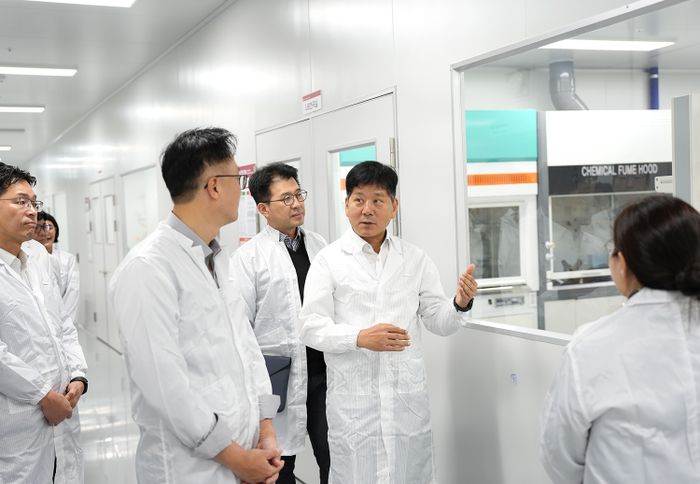김연섭 슬롯 무료에너지머티리얼즈 대표이사(사진 왼쪽에서 4번째)가 의왕연구소를 둘러보고 있다. ⓒ슬롯 무료에너지머티리얼즈