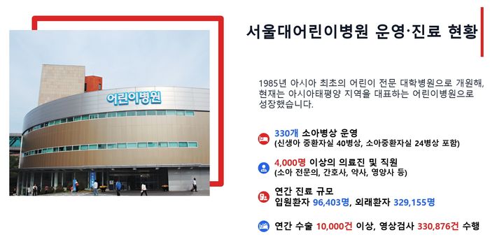 또 10개의 소아전용 수술실과 로봇수술실 1개, 소아 전담 마취과팀을 갖춘 수술 인프라를 기반으로 매년 600건 이상의 심장수술과 500건의 뇌수술을 포함해 1만 건이 넘는 소아수술을 시행하고 있으며, 연간 33만 건 이상의 영상검사를 통해 정밀하고 전문화된 진료 체계를 운영하고 있다.