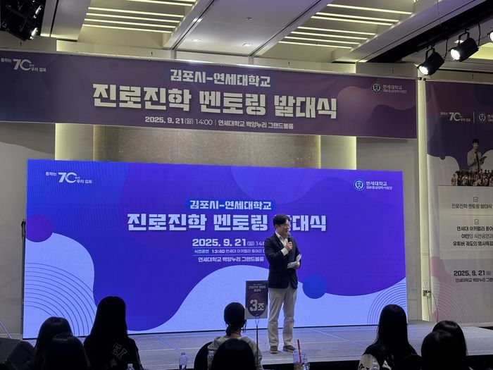 김병수 슬롯존시장이 지난 9월 슬롯존시-연세대 진로 진학 멘트링 발대식에서 인사말을 하고 있다. ⓒ 슬롯존시 제공
