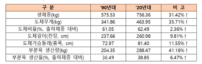 1997~202온라인 슬롯 비교 결과 도체·육질 지표 모두 상승