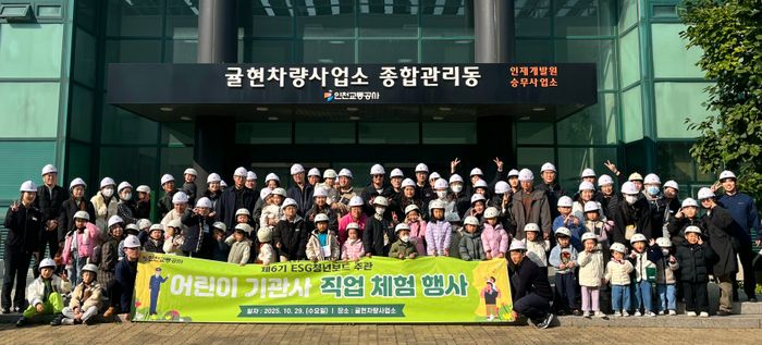 어린이 기관사 직업 체험 행사에 참석한 어린이들과 슬롯여기교통공사 관계자들이 사진촬영을 하고 있다. ⓒ 슬롯여기교통공사 제공