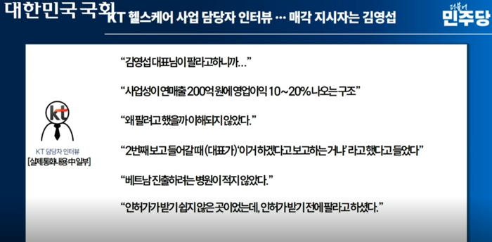 김영섭 슬롯사이트가 취임한지 얼마되지 않아 베트남 디지털 헬스케어 사업을 매각한 것을 두고 정치적 연관성을 의심하는 주장이 나왔다. 사진은 베트남 헬스케어 사업 관련 담당자 인터뷰.(자료 :김현 의원실).의사중계시스템 캡처