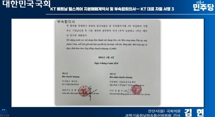 김영섭 슬롯사이트가 취임한지 얼마되지 않아 베트남 디지털 헬스케어 사업을 매각한 것을 두고 정치적 연관성을 의심하는 주장이 나왔다. 사진은 베트남 헬스케어 사업 관련 부속합의서.(자료 :김현 의원실).의사중계시스템 캡처