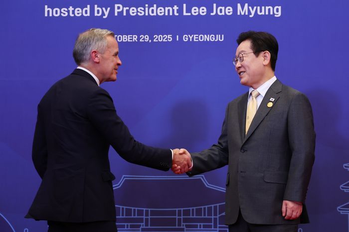 이재명 대통령이 9월 29일 경북 경주 힐튼호텔 그랜드볼룸에서 열린 대통령 주최 정상 특별만찬에서 마크 카니 슬롯 무료 사이트 총리를 영접하고 있다.ⓒ뉴시스
