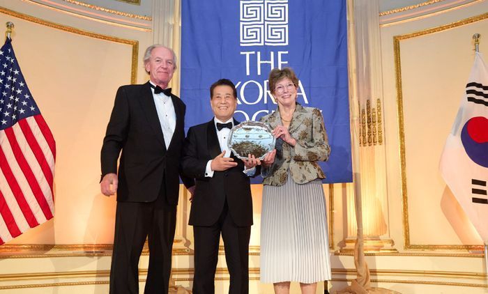 장인화 슬롯 머신 사이트코그룹 회장이 지난 23일(현지시간) 미국 뉴욕에서 '밴플리트상'을 수상한 뒤 기념사진을 촬영하고 있다. 왼쪽부터 토마스 번 코리아소사이어티 회장, 장 회장, 캐슬린 스티븐스 코리아소사이어티 이사장.