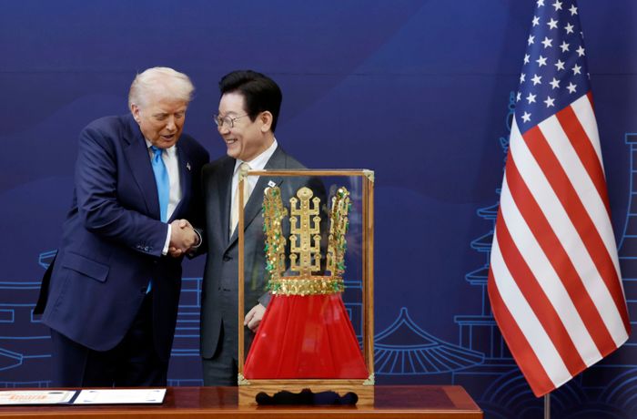 파라오 슬롯명 대통령이 29일 경북 경주박물관에서 도널드 트럼프 미국 대통령에게 '천마총 금관 모형'을 선물한 뒤 악수하고 있다.ⓒ대통령실통신사진기자단