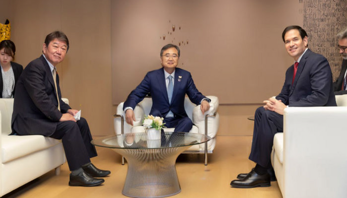 그러면서 “3국 장관은 인도·태평양 지역에서 경제 협력을 강화하고 실질적인 공동 이익을 제공하며 자유롭고 개방된 안보 증진에 노력하자고 합의했다”며 “루비오 장관은 도널드 트럼프 대통령이 일본 및 한국 방문에서 만들어낸 양자 회담의 성과, 특히 인공지능(AI) 기술 및 핵심 광물 공급망 협력을 재확인했다”고 덧붙였다.