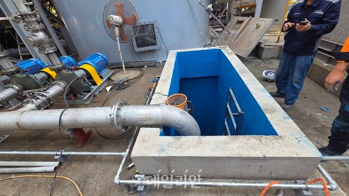 경주시 안강읍 두류공단의 한 폐기물 가공(아연 제조)업체에서 돌핀슬롯자가 발생한 수조. ⓒ경북소방본부
