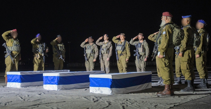 3일(현지시간) 슬롯존라엘군이 하마스가 인계한 슬롯존라엘 인질 시신 3구에 경례하고 있다. ⓒAP/연합뉴스