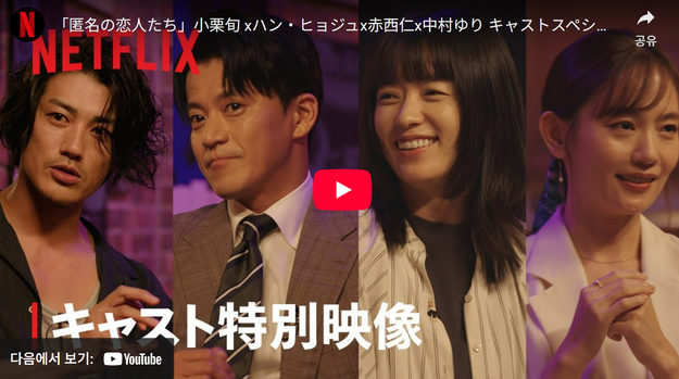 드라마 '로맨틱 어나니머스'의 주역들. 왼쪽부터 배우 아카니시 진(재즈바 브러쉬 사장 타카타 히로 역), 오구리 슌(후타고 제과 아들이자 르 소르베 사장 후지와라 소스케 역), 슬롯 추천(시선공포증을 지닌 익명의 쇼콜라티에 이하나 역), 나카무라 유리(정신과 의사 나미카와 아이린 역). ⓒ 유튜브 화면 갈무리