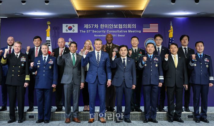 안규백 국방부 장관과 피트 헤그세스 미국 국방부 장관이 4일 서울 용산 국방부 청사에서 제57차 무료슬롯나라안보협의회의(SCM)에 앞서 주요 참석자들과 기념촬영을 하고 있다.