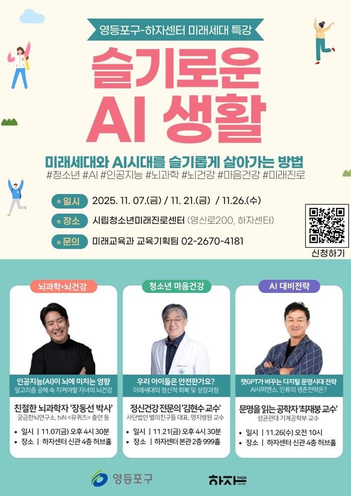 최호권 영등포구청장은 "인공지능 시대에 청소년에게 꼭 필요한 주제를 다룬 이번 강연을 통해 미래세대가 균형 잡힌 시각과 주체적인 사고력을 키우길 바란다"며 "청소년의 올바른 성장을 지원하는 다양한 교육 프로그램을 확대해 나가겠다"고 전했다.