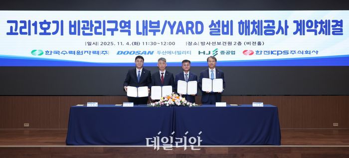 한국수력원자력은 4일 서울 온라인 슬롯 방사선보건원에서 고리1호기 비관리구역 설비 해체공사 낙찰자로 선정된 두산에너빌리티·HJ중공업·한전KPS(두산에너빌리티 컨소시엄)와 계약을 체결했다.