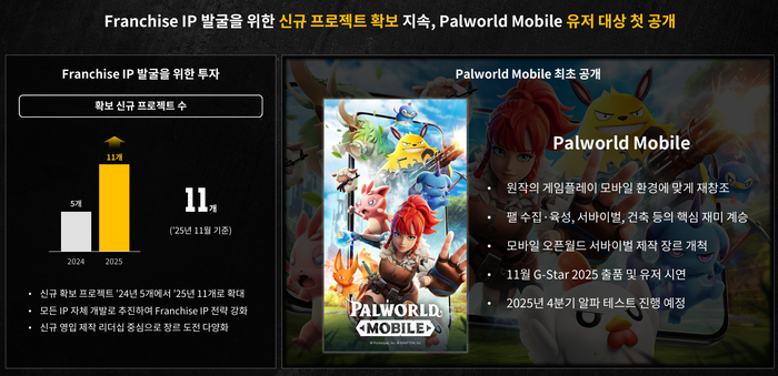 배동근 CFO(최고재무책임자)는 "주요 신작 타이틀인 팰월드 모바일은 원작의 핵심 게임 플레이를 모바일 환경에 맞게 재창조해 모바일 오픈월드 서바이벌 장르를 개척하고자 한다"며 "팰 수집과 육성, 오픈월드, 서바이벌, 건축 재미를 모바일로 제공할 것이다. 오는 12월 일부 지역에서 알파 테스트를 진행해 핵심 게임성을 확인할 것"이라고 말했다.