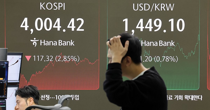 인공지능(AI) 관련 업종 고평가 우려 속에 코스피는 전일보다 117.32포인트(2.85%) 내린 4004.42로 장을 마쳤다. 외국인은 유가증권시장에서 약 2조5185억원을 순매도했다.