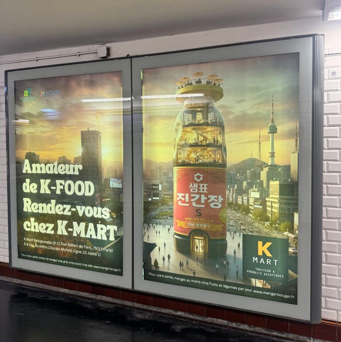 지난 1일, 한 스레드 이용자가 'Amateur de K-FOOD, Rendez-vous chez K-MART(K-푸드를 사랑하는 분이라면, K-MART로 오세요)’라는 문구와 함께 ‘슬롯 머신 사이트 진간장 S’가 담긴 옥외광고를 소개했다.