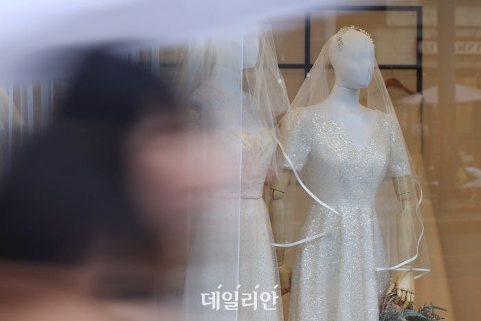 서울 마포구 아현동 웨딩거리 한 웨딩드레스 판매점 앞을 시민들이 지나가고 있다.ⓒ뉴시스