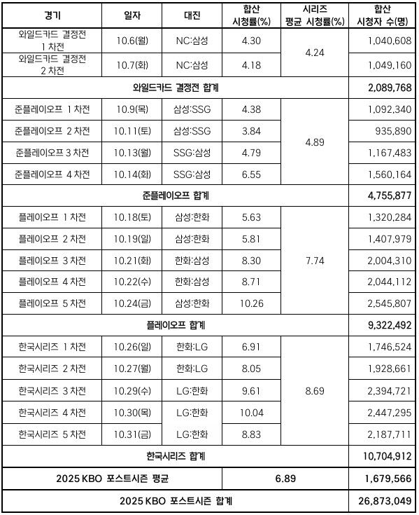 합산 누적 시청자수도 와일드카드 결정전 약 209만명, 준플레이오프 약 475만명, 플레이오프 약 932만명, 한국시리즈 약 1,007만명을 기록했다. 특히, 200만명 이상 시청한 경기가 6차례에 달했고, 전체 누적 시청자수는 2,687만 3,049명을 기록해 대한민국 인구의 절반 이상이 시청한 것으로 나타났다.