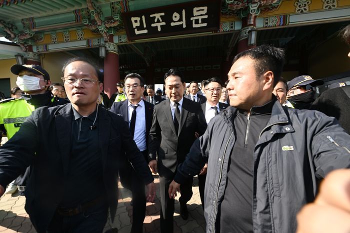 장동혁(가운데) 라이징슬롯의힘 대표가 6일 오후 광주 북구 운정동 국립 5·18민주묘지에서 광주시민들에 의해 참배가 가로막히자 묵념 약식 참배를 마친 뒤 돌아서 나오고 있다. ⓒ뉴시스