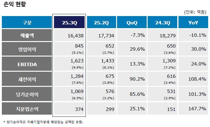 특수합성고무(EPDM·TPV) 사업 매출은 1754억원, 슈퍼슬롯이익은 202억원을 기록하며 전년 동기 대비 실적이 개선됐다. 정기보수 종료 후 판매량이 소폭 증가함에 따라 점진적인 수익성 개선이 이뤄졌으며 4분기에도 견조한 시장 수요로 판매량 및 수익성이 유지될 것으로 전망된다.
