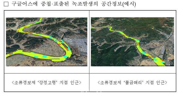 사용자는 날짜와 항목을 선택하면 수질예측모델 결과가 자동 변환돼 3차원 위성지도(구글어스)에 중첩 표시된다. 이를 통해 복잡한 데이터 처리 과정 없이 구간별 녹조 발생량과 수질 변화를 직관적으로 확인할 수 있다.