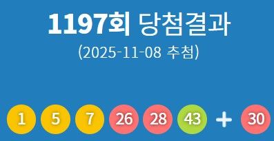 8일 동행복권은 제1197회 로또 슬롯 머신 사이트번호가 '1·5·7·26·28·43'번이라고 밝혔다. 보너스 번호는 30번이다.