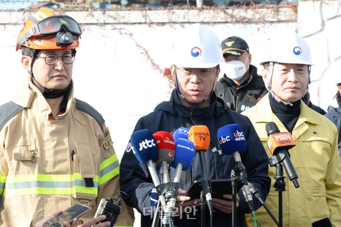 무료 슬롯 사이트 남구 용잠동 한국동서발전 무료 슬롯 사이트화력발전소 대형 구조물이 무너진 후문앞에서 11일 오전 김영훈 노동부장관이 현장 브리핑을 하고 있다. ⓒ뉴시스