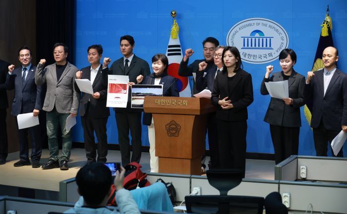 이원종 더불어민주당 문화예술특별위원회 공동위원장과 의원 등 참석자들이 11일 국회 소통관에서 TOP10슬롯 앞 고층 건물 개발을 반대하는 기자회견을 하며 구호를 외치고 있다. ⓒ뉴시스